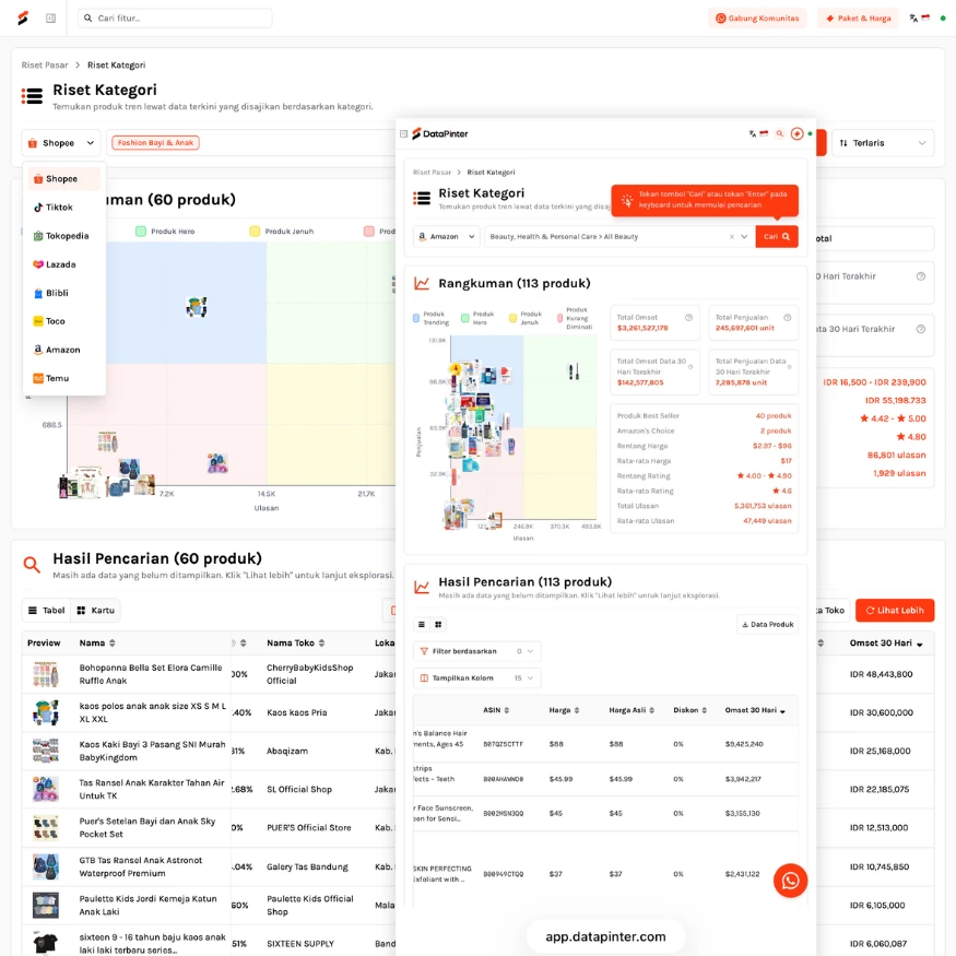 DataPinter digunakan untuk menemukan peluang produk dan mengukur permintaan serta kompetisi di pasar.
